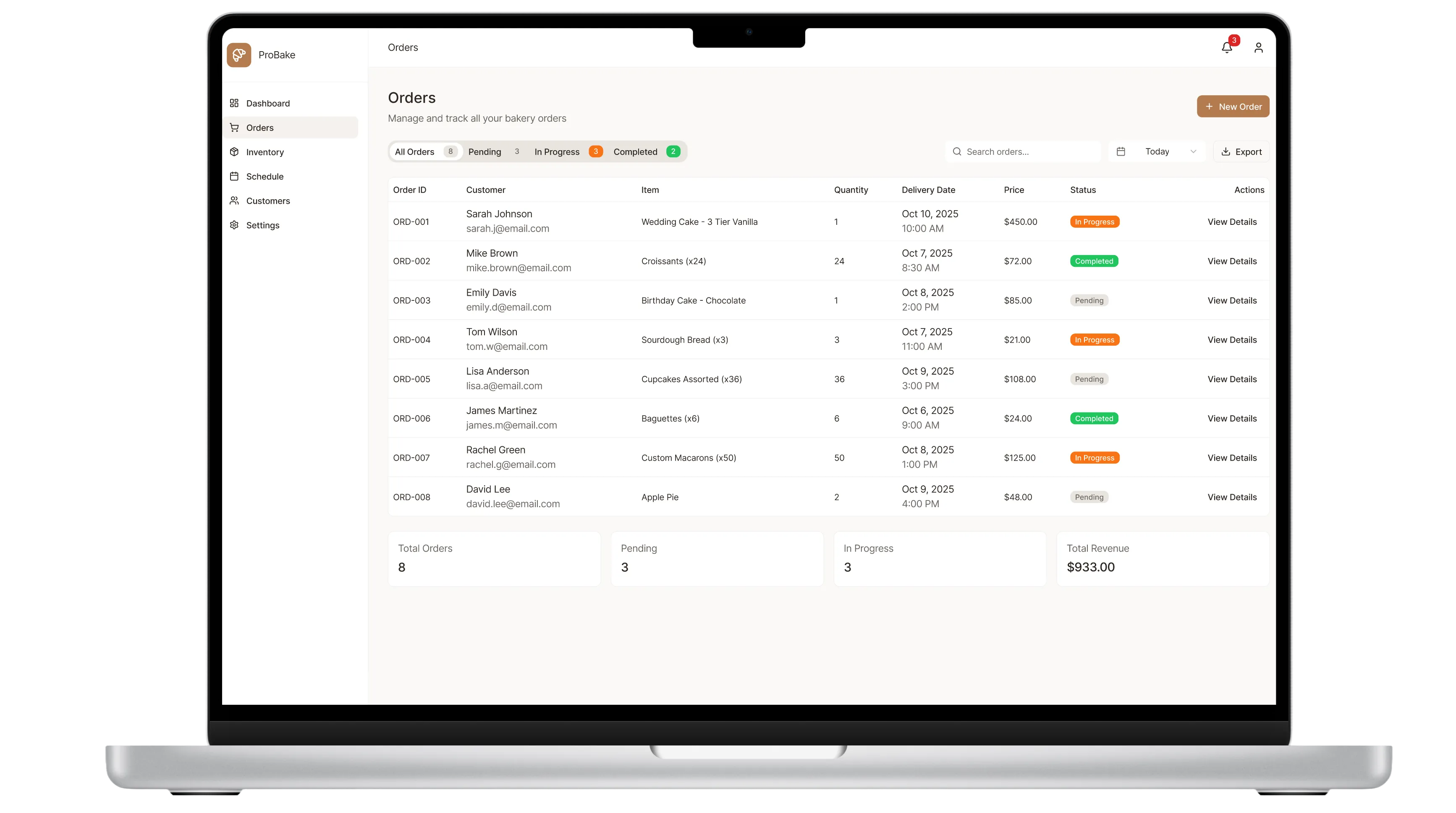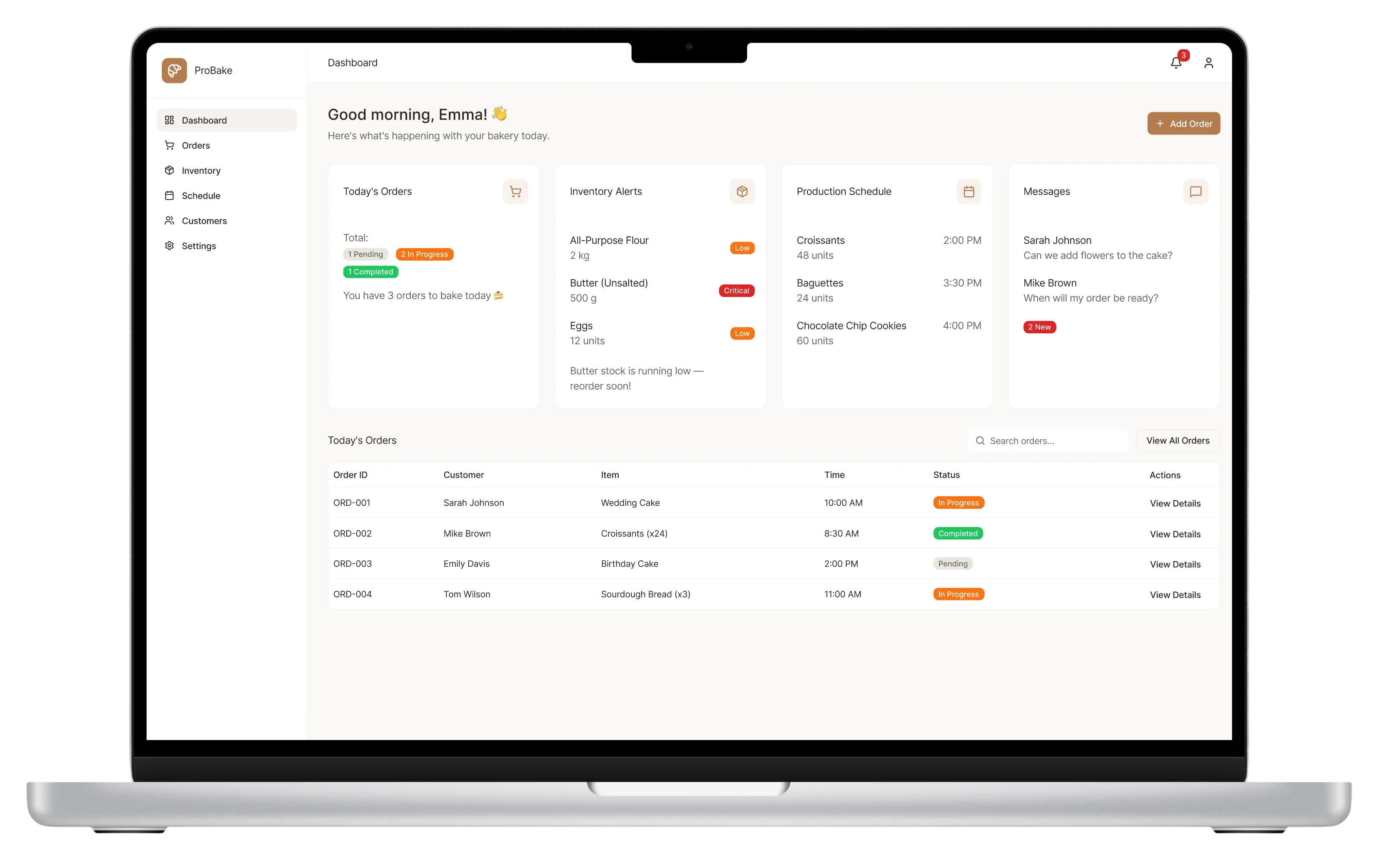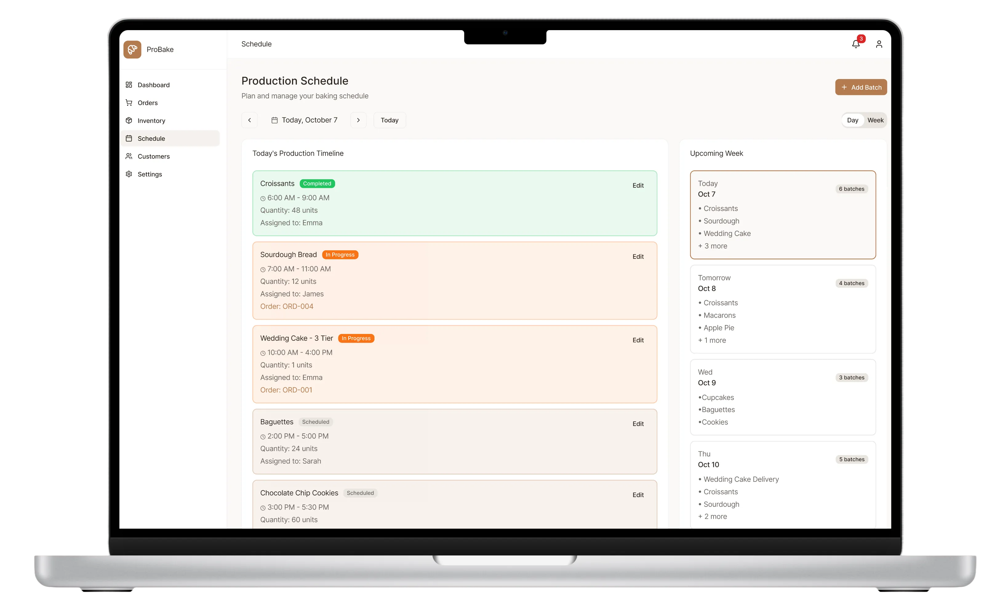 ProBake App is a web-based platform designed to help small bakery business owners streamline their daily operations from order tracking and inventory management to production scheduling and customer interactions, all in one intuitive workspace.