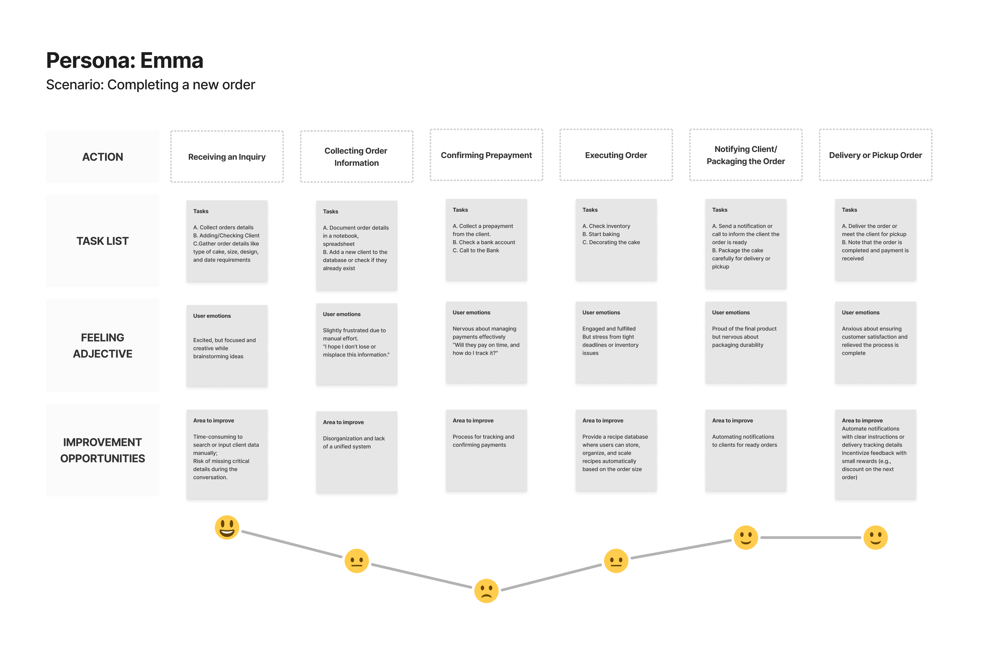 To understand how small bakery owners manage daily operations, I analyzed their end-to-end order workflow and reviewed existing bakery management tools.User journey mapping revealed key pain points: recurring friction around order clarity, repeated data entry, and limited visibility into payments and delivery leading to targeted UX solutions like client profiles, smarter order forms, and automated alerts.