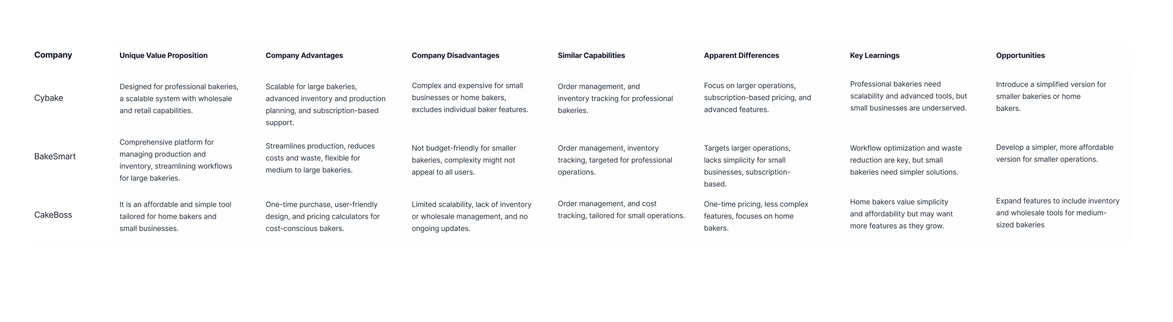 In parallel, a competitive audit of Cybake, BakeSmart, and CakeBoss highlighted complex interfaces and feature overload, reinforcing the need for a simpler, task-focused solution tailored to small bakeries.