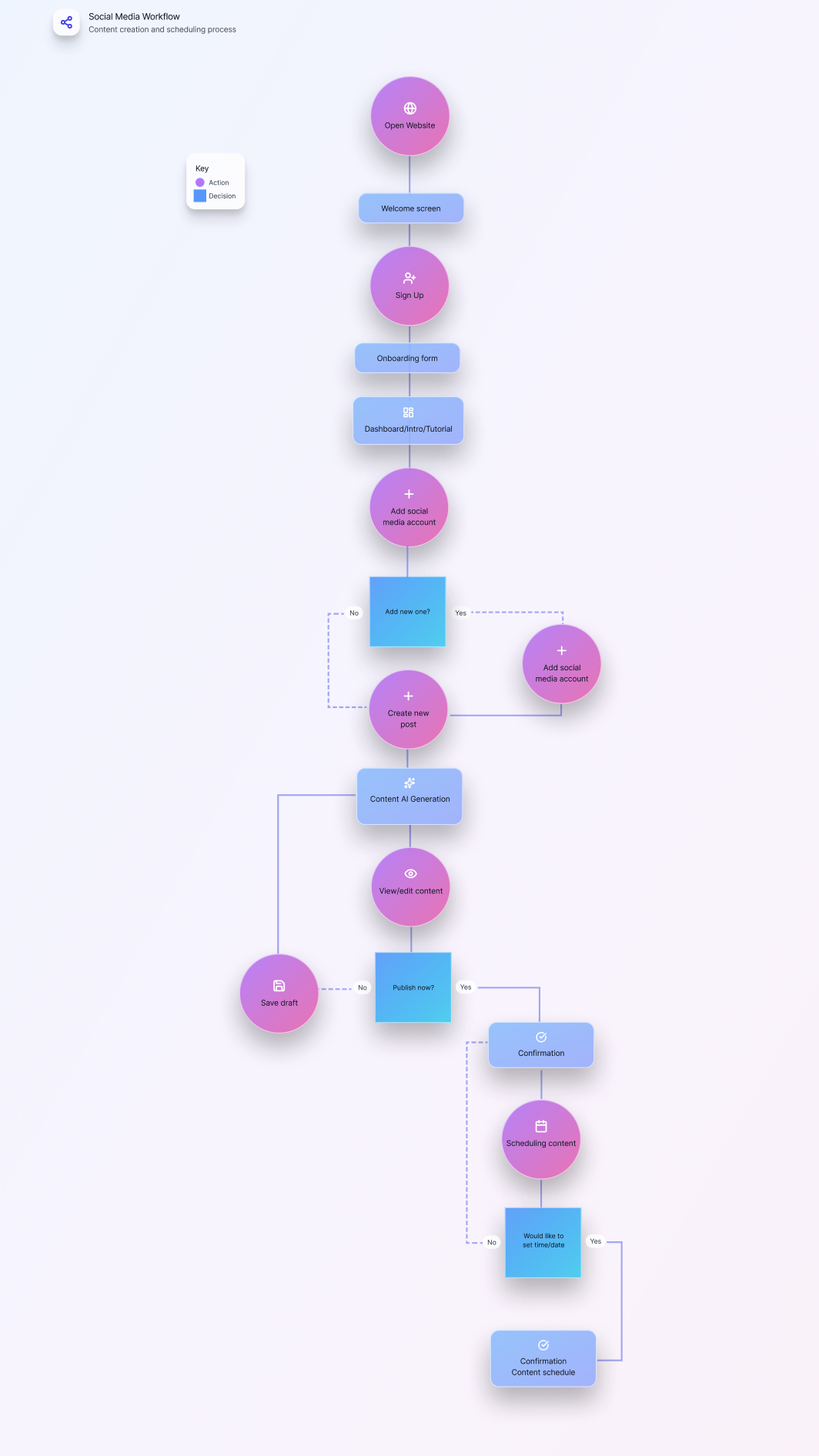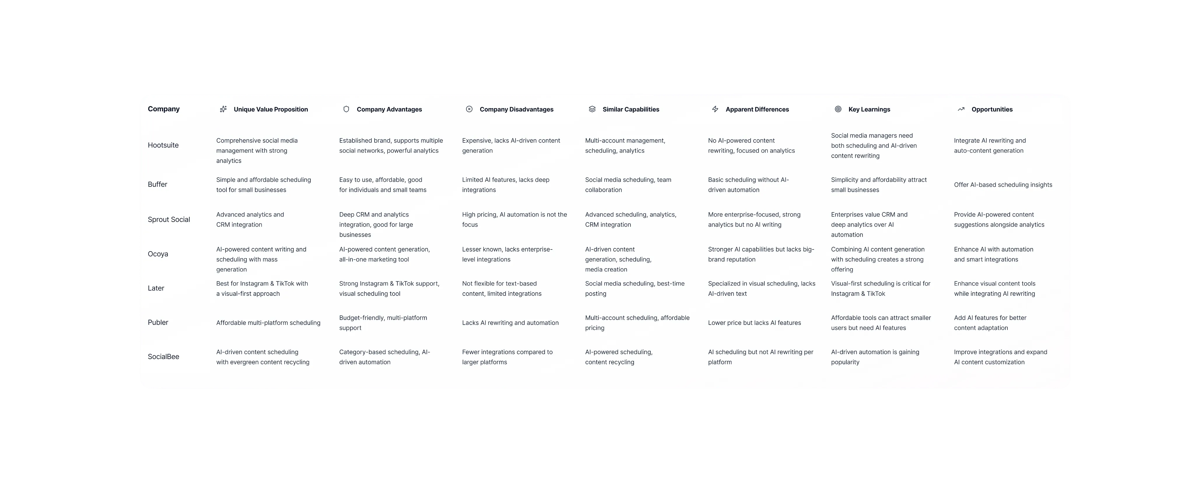 I began with in-depth user research to understand how solo creators and news curators manage their social media presence. Through interviews and workflow analysis, I uncovered recurring pain points around time-consuming scheduling and the complexity of existing tools. A competitive analysis revealed clear opportunities to improve AI integration, automation, and mobile usability.
