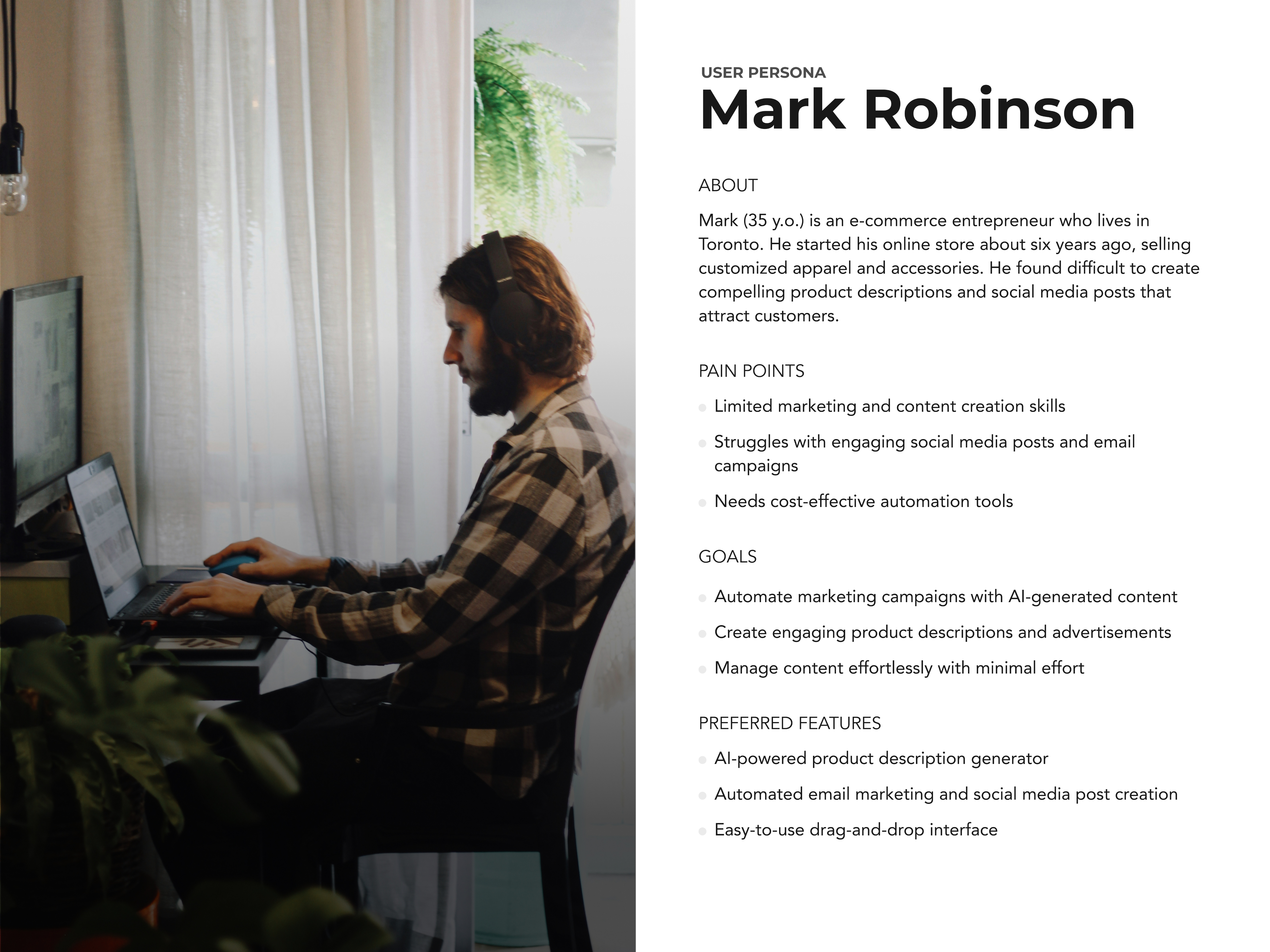 Based on research findings, I created three primary personas representing different user segments. Content creators looking for AI-generated media assets, small business owners seeking an easy-to-use platform with automation, and news publishers using AI-powered parsing for news curation.